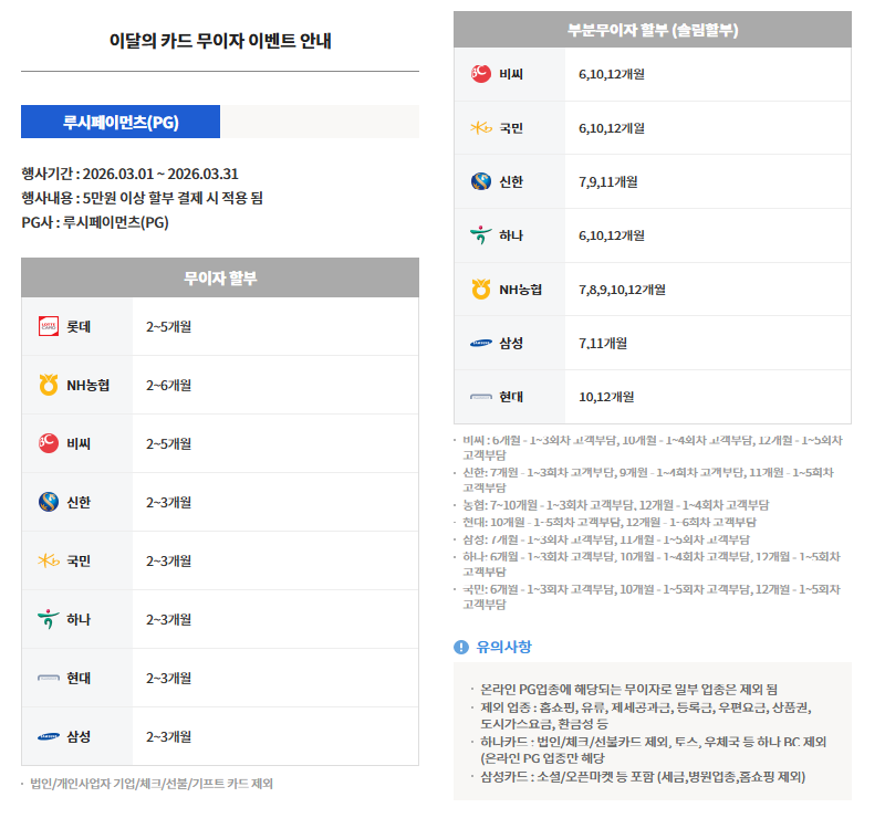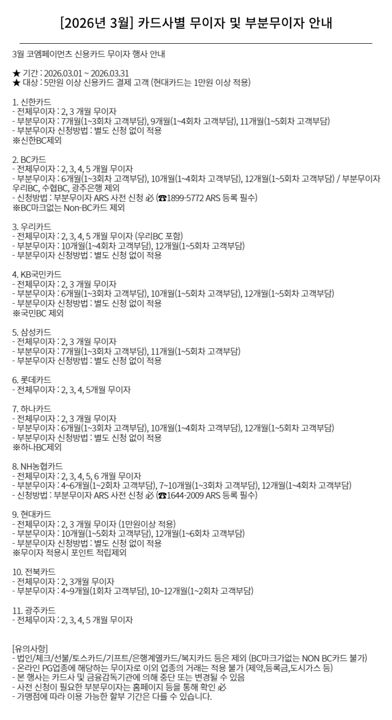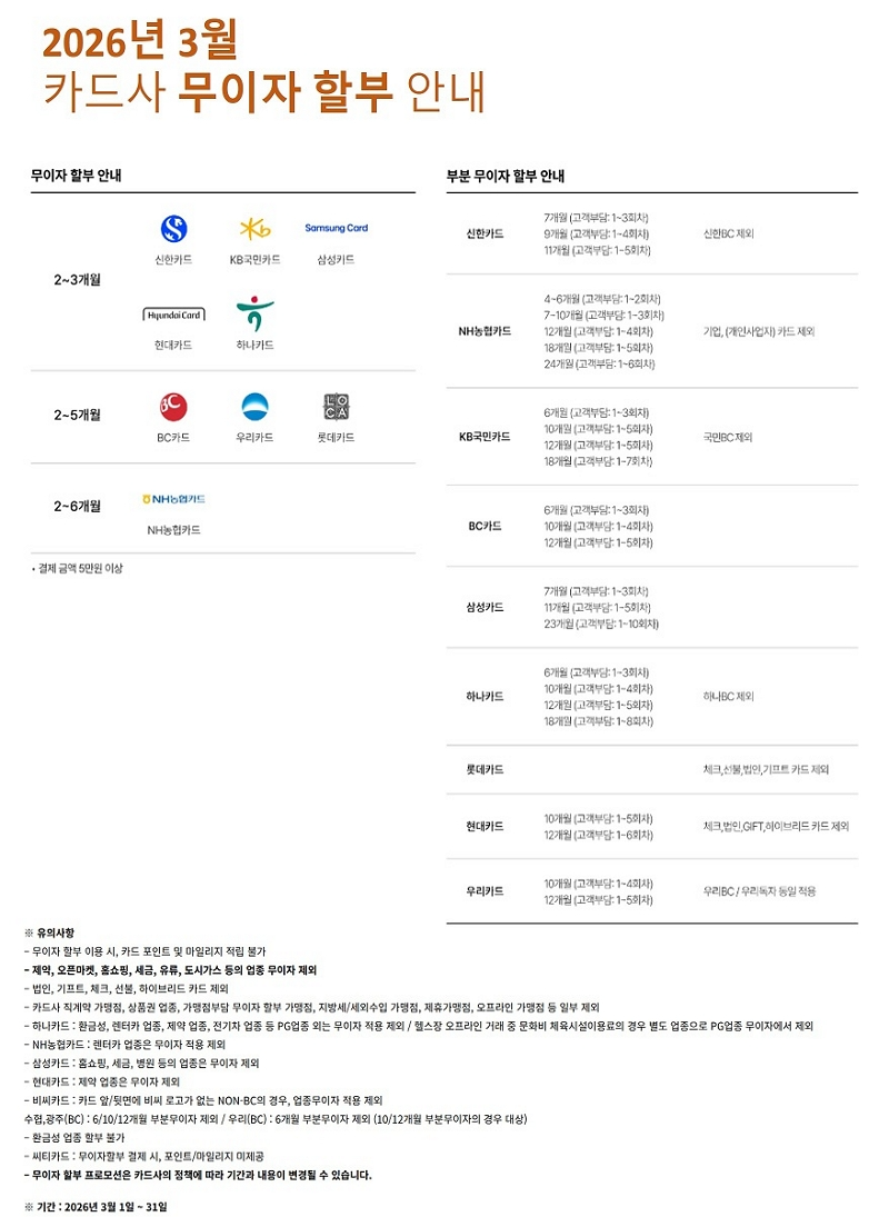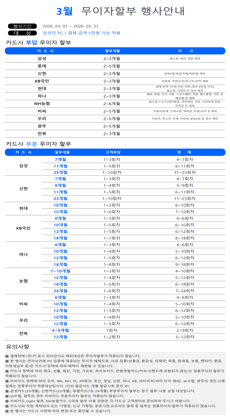 | 2026년 3월 카드사별 무이자 할부 안내 | |