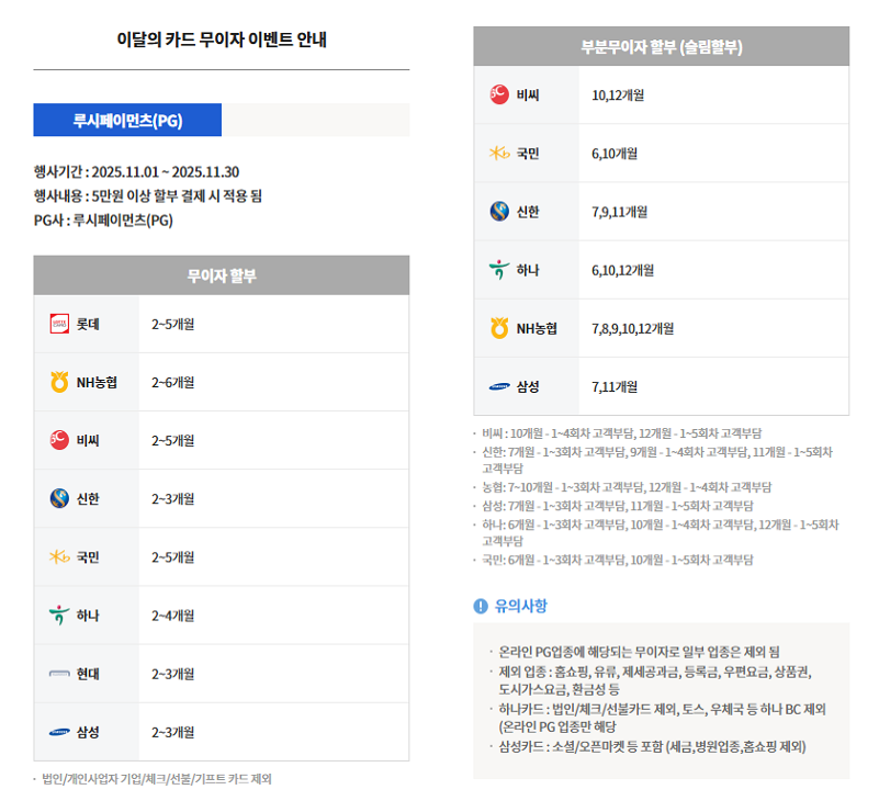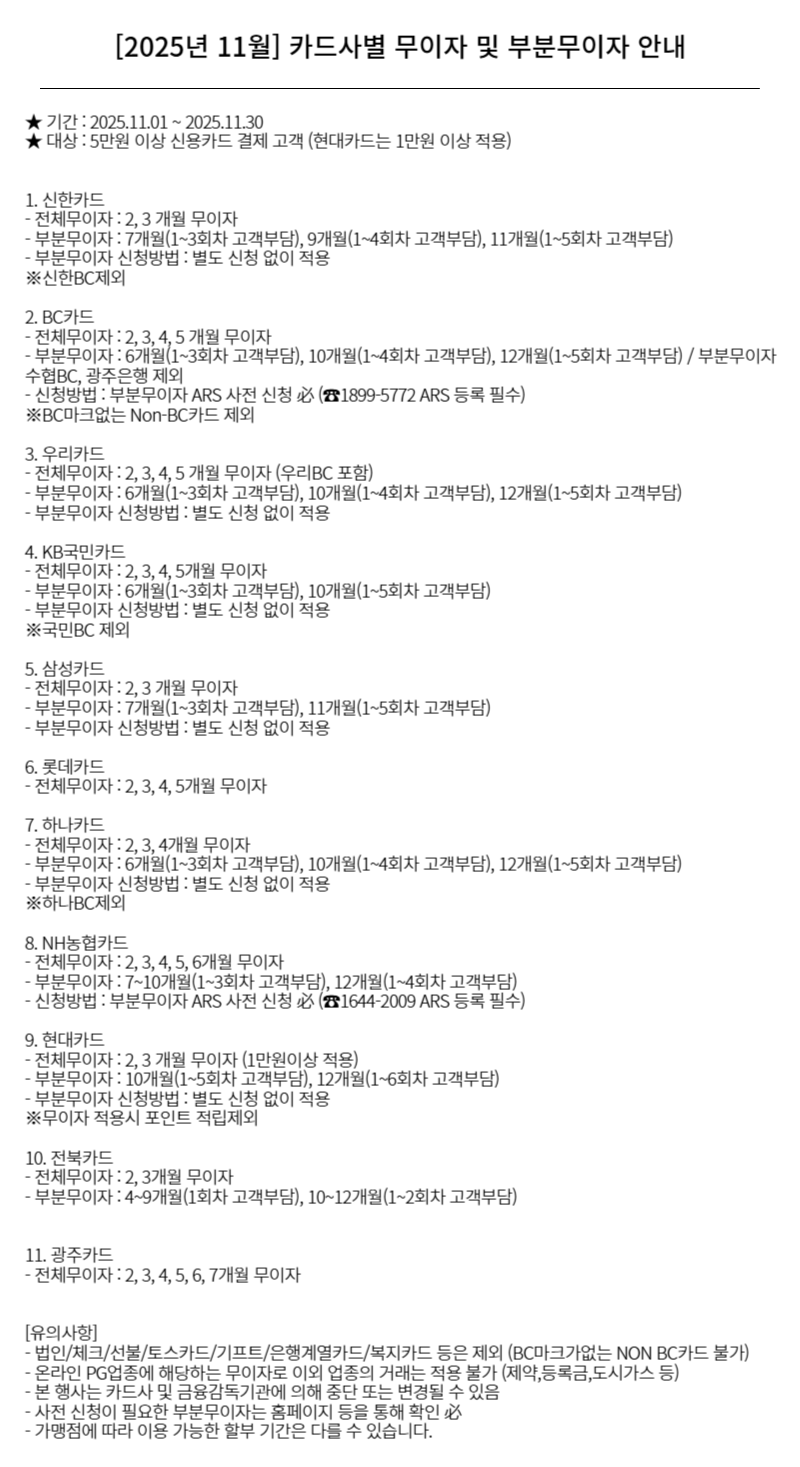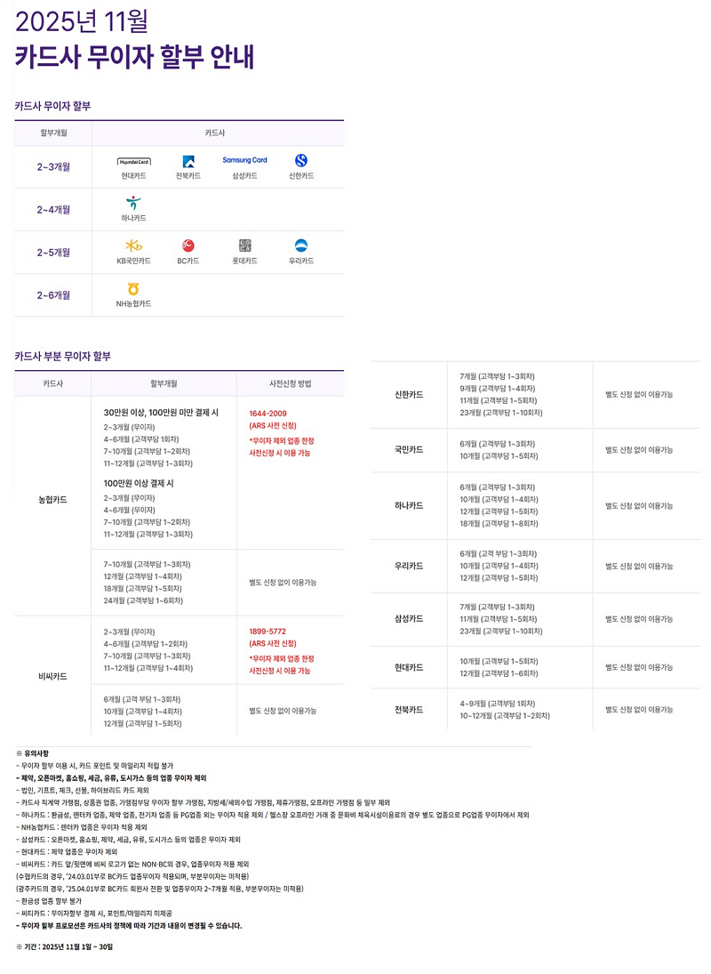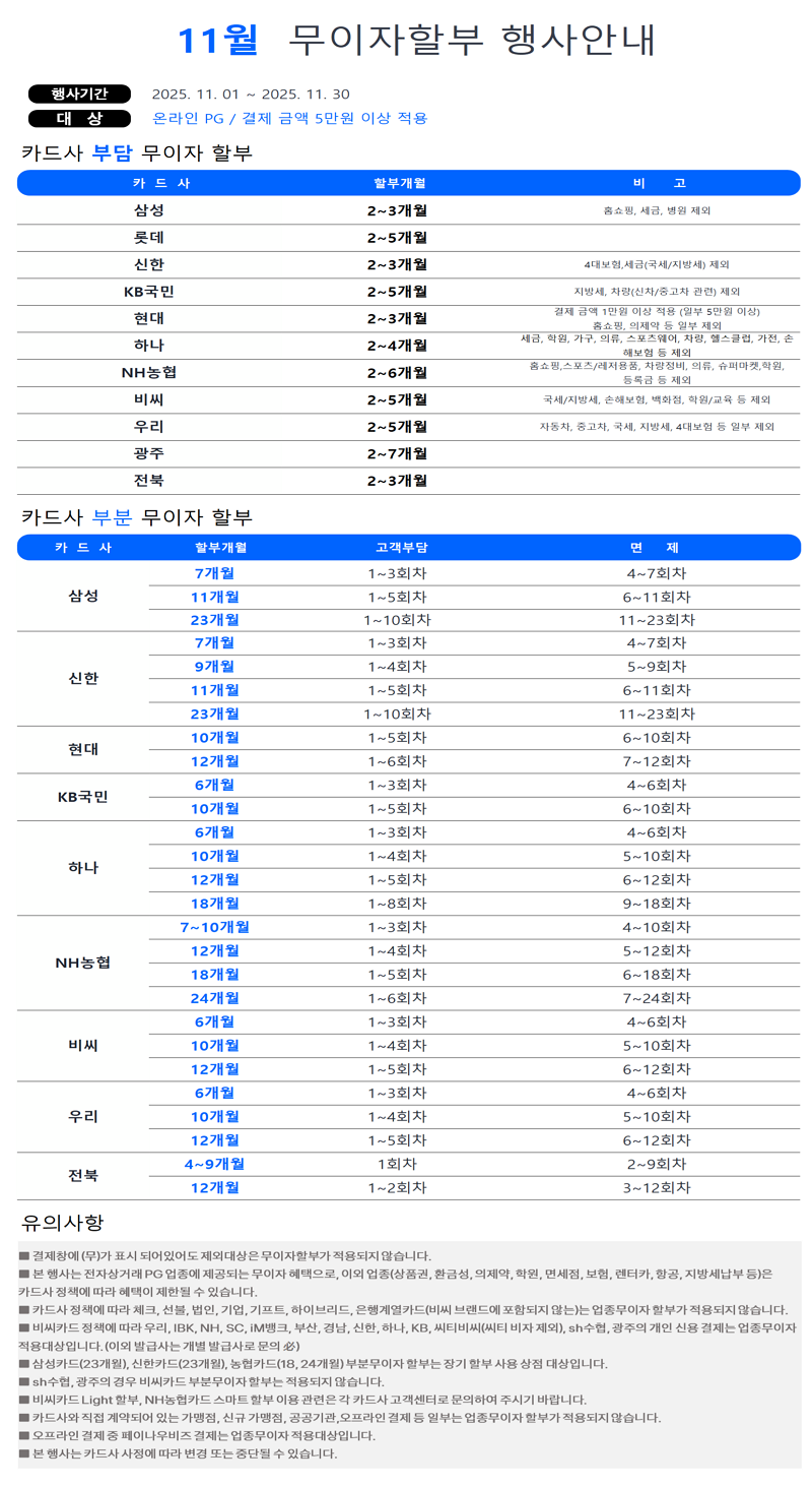 | 2025년 11월 카드사별 무이자 할부 안내 | |