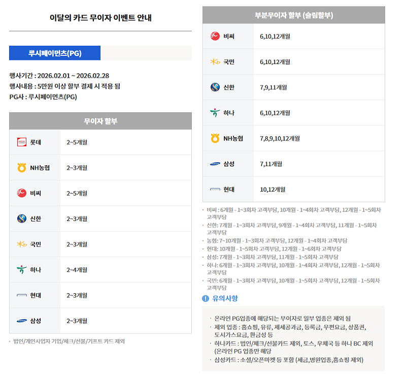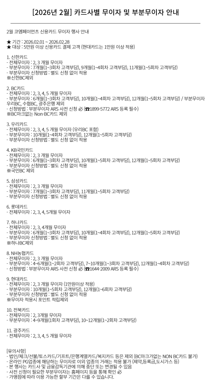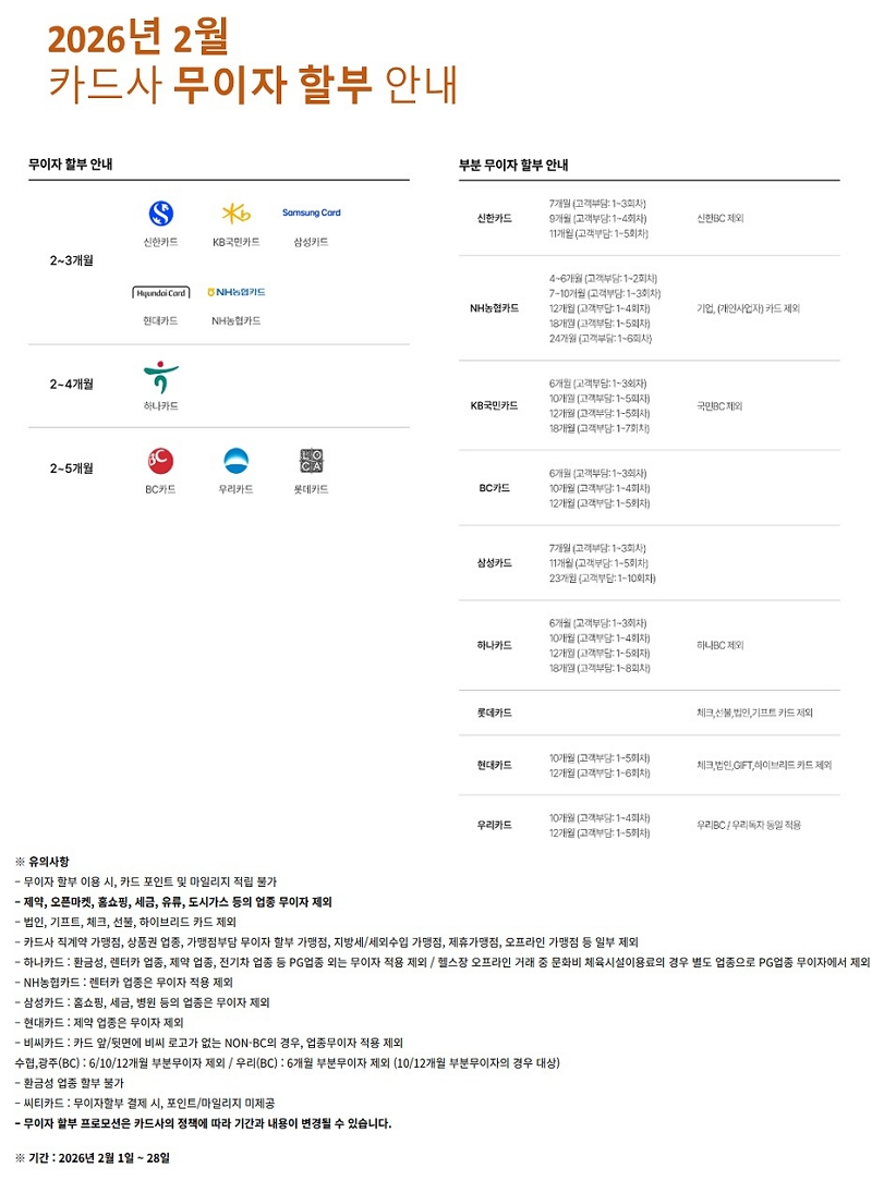 | 2026년 2월 카드사별 무이자 할부 안내 | |
