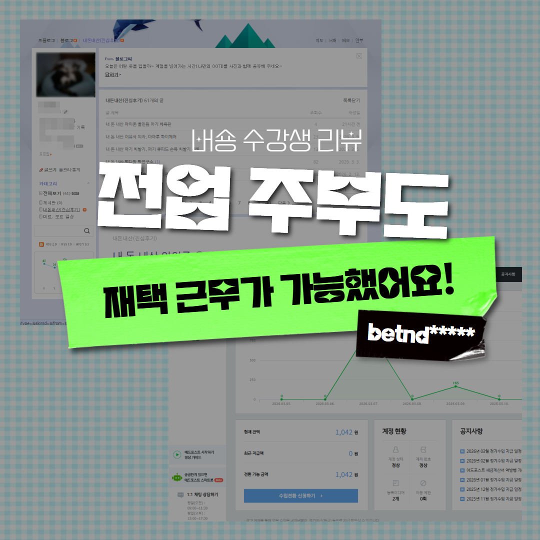 안녕하세요. 저는 부업 겸 취미로 블로그를 운영하고 있는 워킹맘입니다^^ 아이를 출산하고 육아를 하면서 일까지 복귀하면서 오전만 근무를 하고 있어 수입이 반토막이 되고 나니 씀씀이가 줄게 되더라고요. 그래서 퇴근 후 아이가 어린이집에 있는 시간 동안 할 수 있는 일이 없을까???? 찾아보다 버숑을 알게 되었어요~ 첨엔 새로운 것을 배워볼 생각에 기대했다가도 막상 시작하려니 잘할 수 있을까 걱정이 되기도 했었어요. 근데 남편이 "돈 걱정 말고 취미로 시작해봐!" 하는 말에 홀린 듯 몰래 결제 완료! 그렇게 9월부터 멘토님 피드백 받으면서 두 달 동안 진짜 빡세게 배웠어요. 글 쓰는 스킬도 늘고 포스팅 숫자도 쭉쭉 올라가면서, 아이와의 추억도 자연스레 쌓이더라구요? 그렇게 꾸준히 하니까 블로그가 활성화되면서 방문자 수도 늘고, 세상에, 애드포스트 승인까지! 최근엔 협찬앱 덕분에 체험단에도 뽑혀서 아이랑 여행도 가고, 꽁돈으로 맛집도 다니게 됐어요. 그리고 요즘은 육아로 푸석해진 내 피부와 머리에 힐링을 해주는 피부샵도 자주 협찬이 들어와 돈 안쓰고 관리 받고 있어요ㅋㅋㅋ 버숑 덕분에 글 쓰는 게 이렇게 재밌고 쏠쏠한 일인지 처음 알았어요. 글쓰는 시간도 확 줄고, 사람들이 내 글을 어떻게 하면 더 많이 보는지 글빨 세우는 노하우까지 득템했어요. 지금 내 목표는 블로그 최적화1 찍는 거예요! 험단 활동이랑 아이와의 소소한 일상글 꾸준히 올리면서, 다른 육아맘들에게 도움 되는 블로그를 만드는 게 작은 바람이에요.